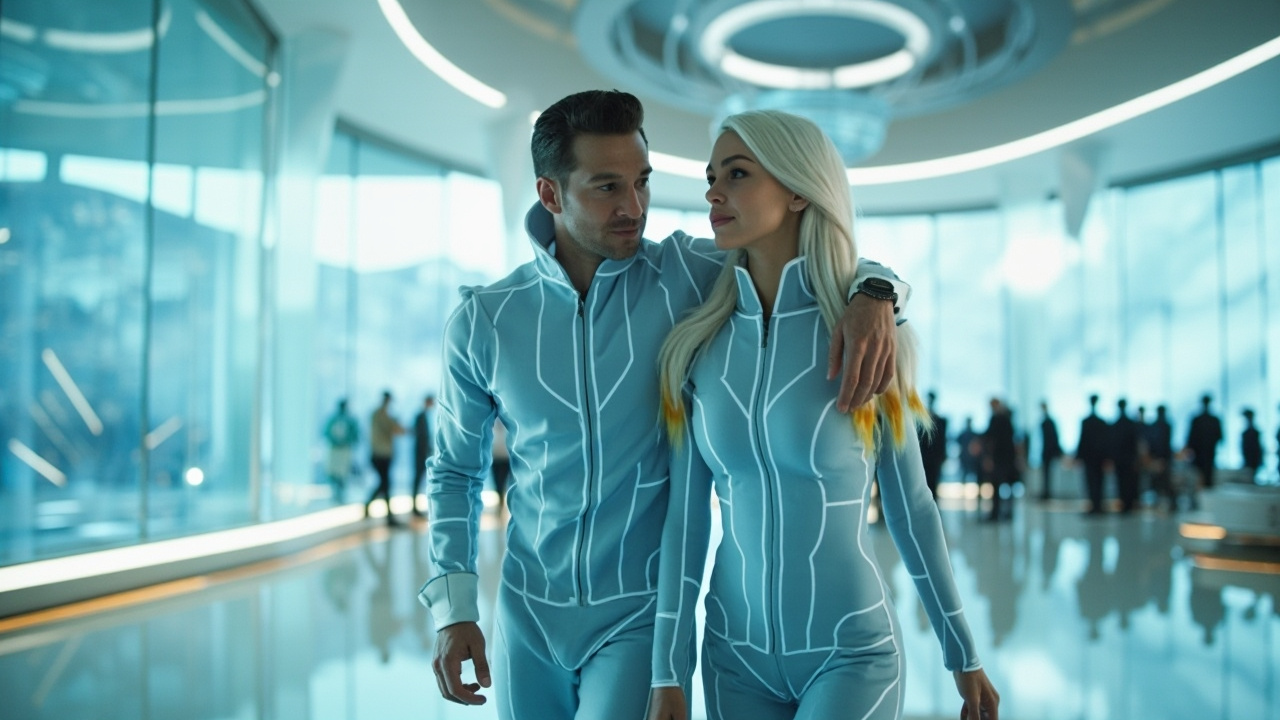 Я резко обернулась и уставилась на направлявшуюся к посадочной зоне сладкую парочку в одинаковых нежно-голубых с белыми обводами комбинезонах. Мужчина бережно приобнимал за плечи платиновую блондинку с позолоченными кончиками волос. За ними, как привязанная, на некотором отдалении, левитировала багажная платформа с багажом.