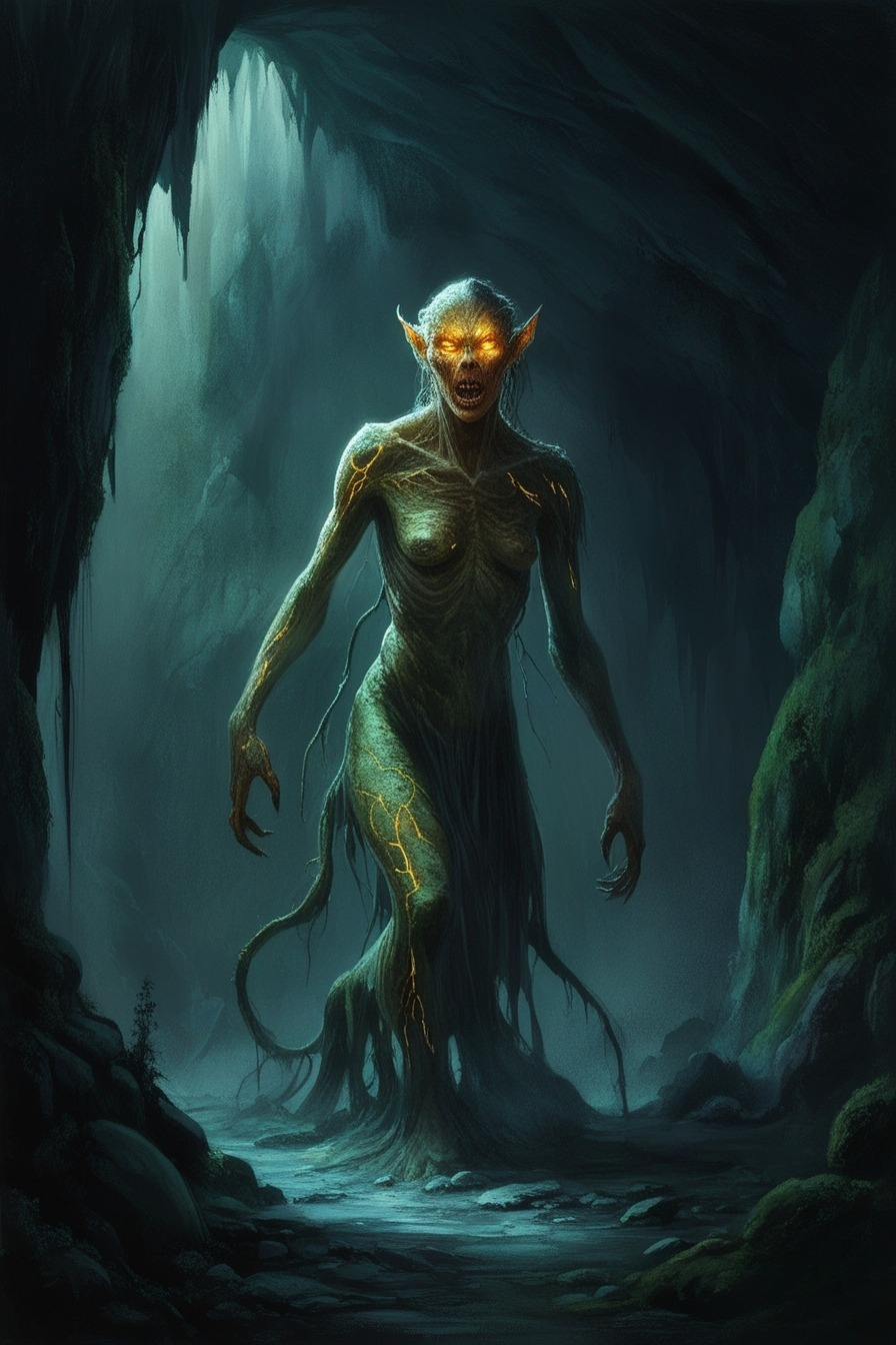 Когда я была в бессознательном состоянии, ко мне подошло какое-то древнее существо. Его вид был настолько страшен, что даже в полубессознательном состоянии я почувствовала холодный ужас, пронизывающий до костей. Его тело, словно плод забытого кошмара, было вытянуто и искривлено, сливая в себе черты человека и зверя, создавая гротескное образец первобытной ужасности. Взглядом, источающим ауру злобы, он пронзал воздух, наполняя его технувшими исподтишка готовящимися кошмарами. Тяжелый воздух был пропитан вонью гниения и сырой земли, словно сама пещера задерживала в своих стенах зловещий дух прошлого. Кожа существа имела темно-зеленый оттенок, будто покрытый мхом камень, с венами, пульсирующими слабым, но жутким голубым свечением, словно жила самой мертвой природы. Глаза существа горели потусторонним янтарным светом, излучая тревожное золотистое сияние, открывая непостижимый мир ужаса, проникнутый древними тайнами и забытыми страхами.