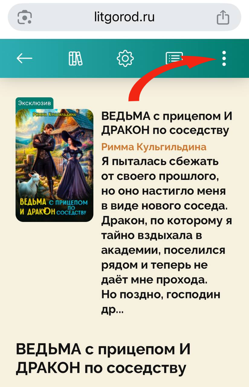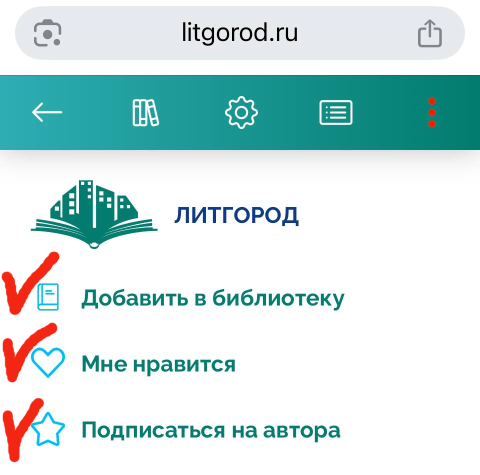 Чтобы отслеживать информацию о скидках и новинках, подписывайтесь. Это можно сделать, не выходя из читалки, просто нажав в верхнем правом углу на три точки (если открыли книгу в телефоне) или на слово "меню" (если читаете на компьютере)