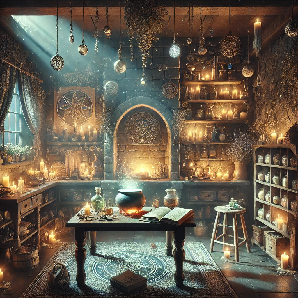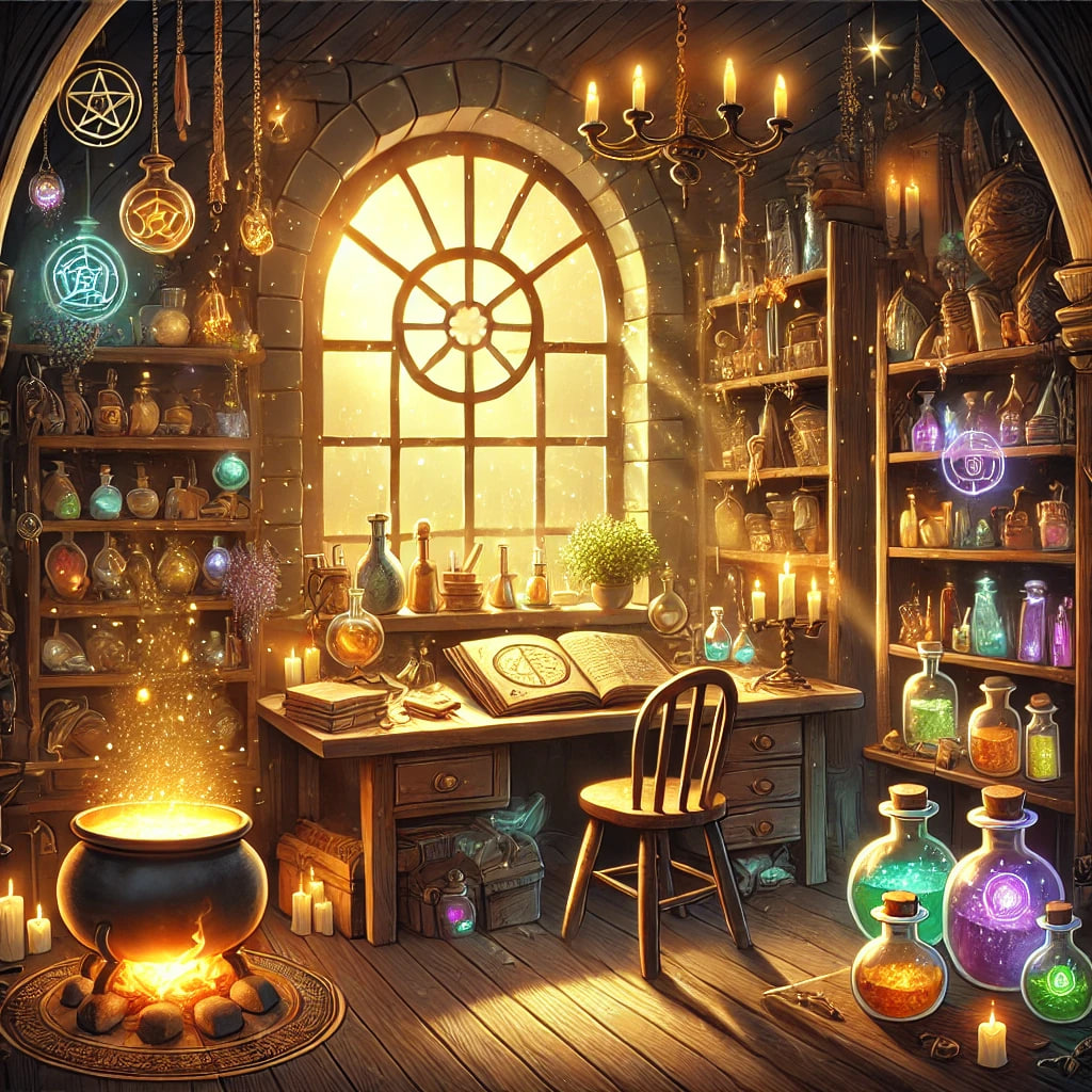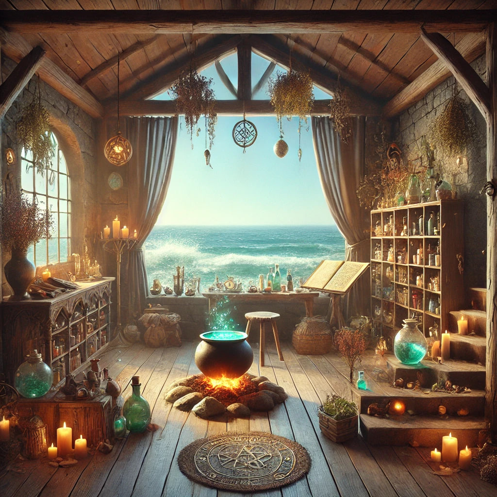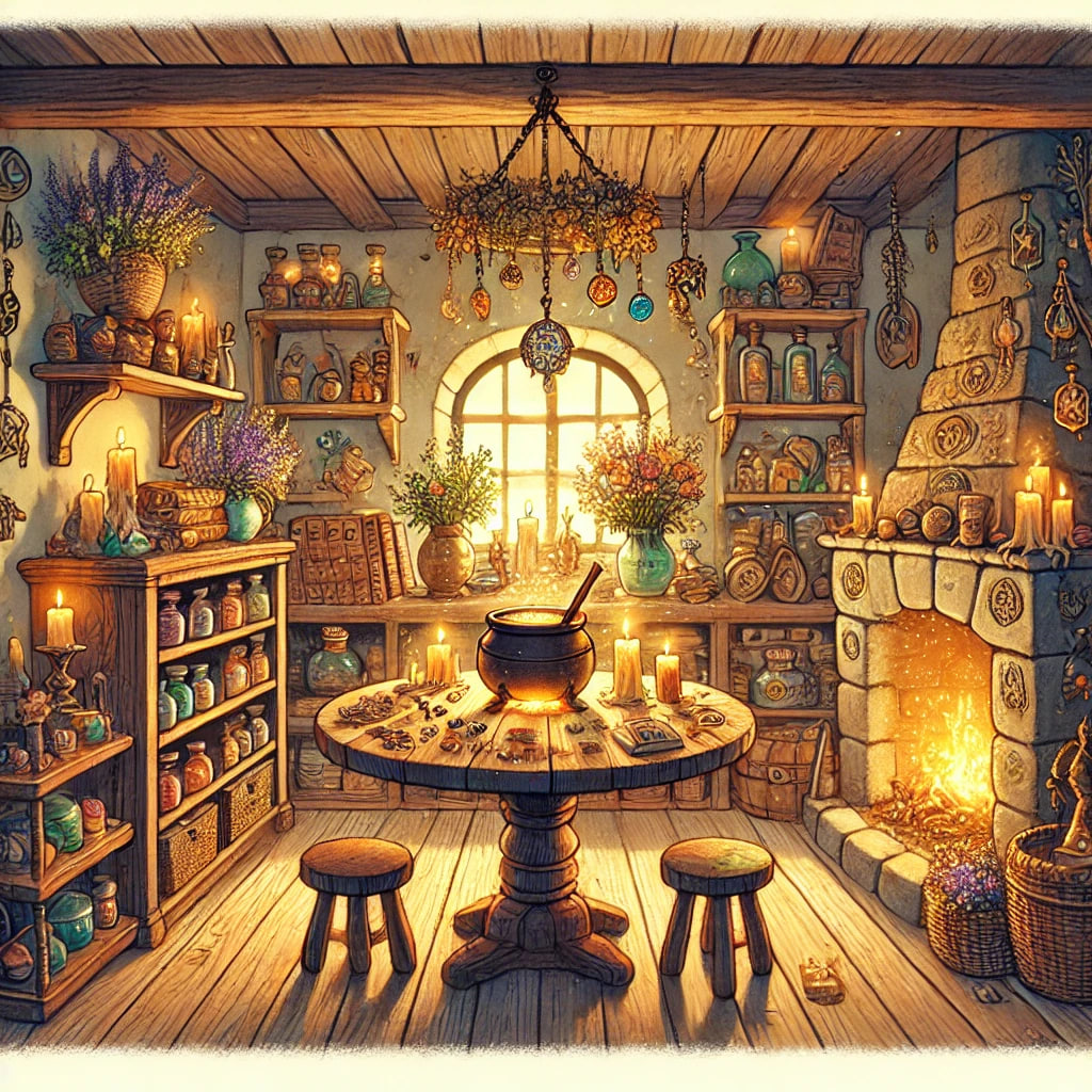 Всё вроде как на своих местах: сушеные травы висели на балках, медные колбы поблескивали на полке, а маленький котёл, который я использовала для зелий, все так же стоял у очага.