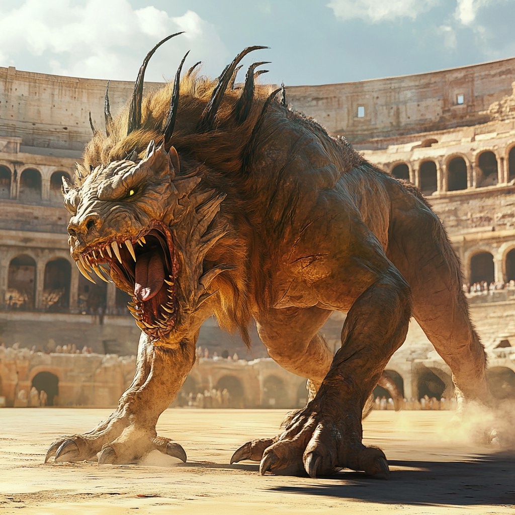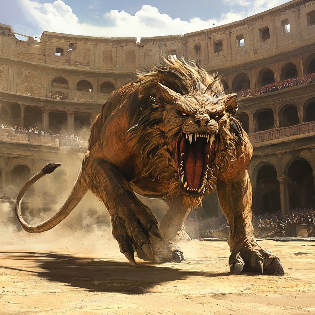 Огромные врата заскрипели. Тяжёлая решетка поднялась, впуская на арену монстра. В пространство вырвался оглушительный рык гигантской саблезубой глотки.