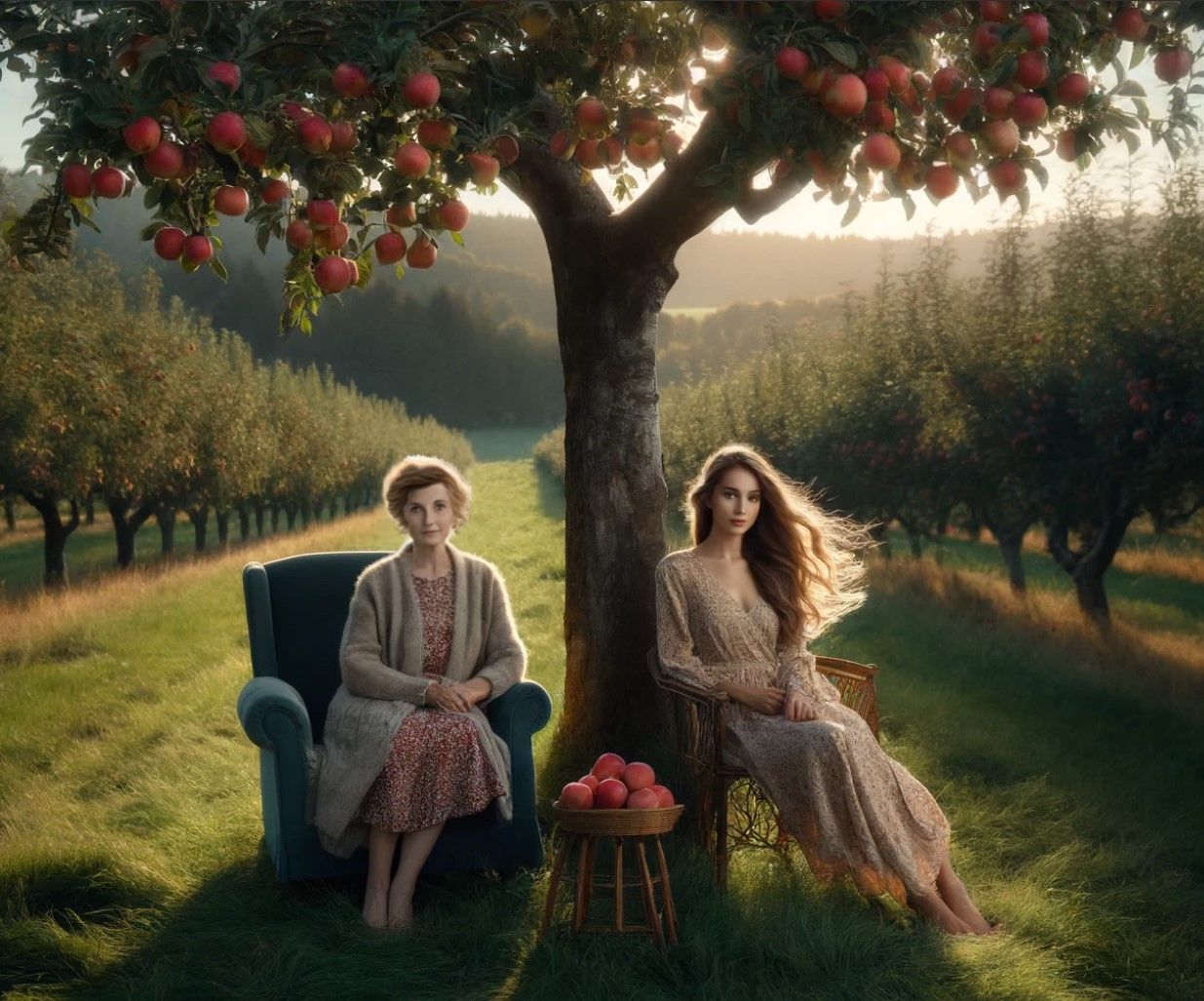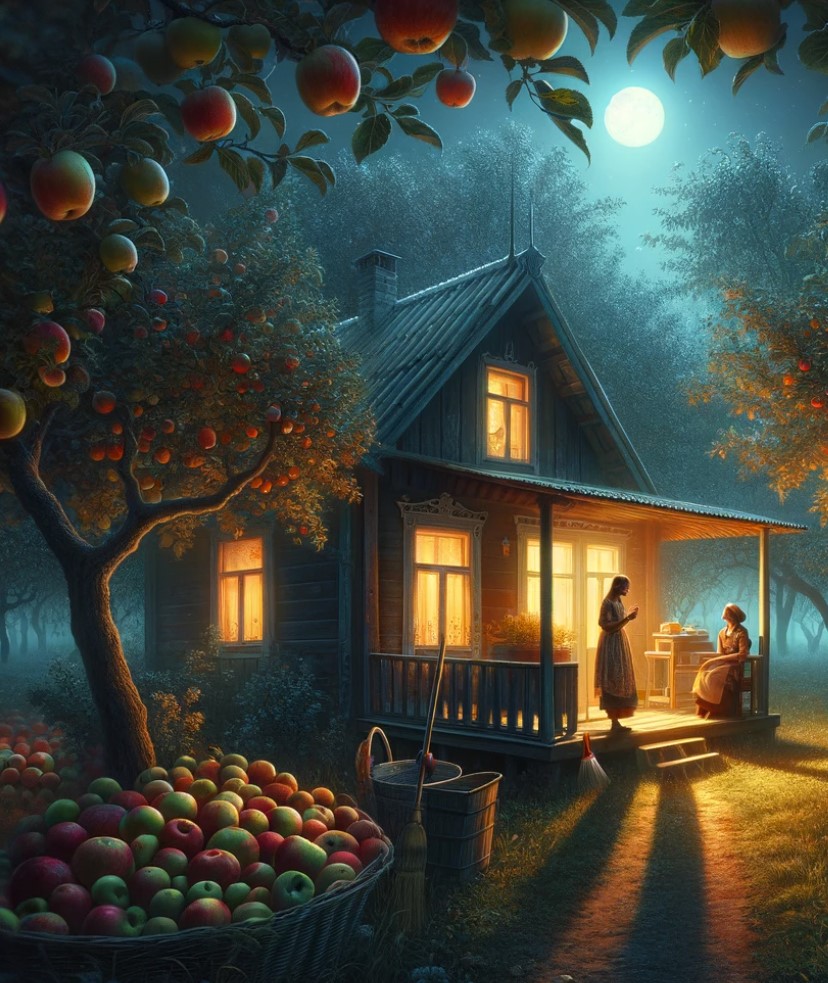 Я, быстро умывшись, вышла на крыльцо и снова замерла, будто в первый раз увидела великолепие яблоневого сада, неожиданно свалившегося нам с мамой на голову в качестве наследства. Нежные розово-золотые оттенки первых солнечных лучей мягко окутали деревья, создавая ощущение волшебства. Лёгкий утренний туман стелился по земле, придавая саду мистическую атмосферу. Яблони стояли в полной тишине, словно впитывая в себя первое тепло занимающегося дня.