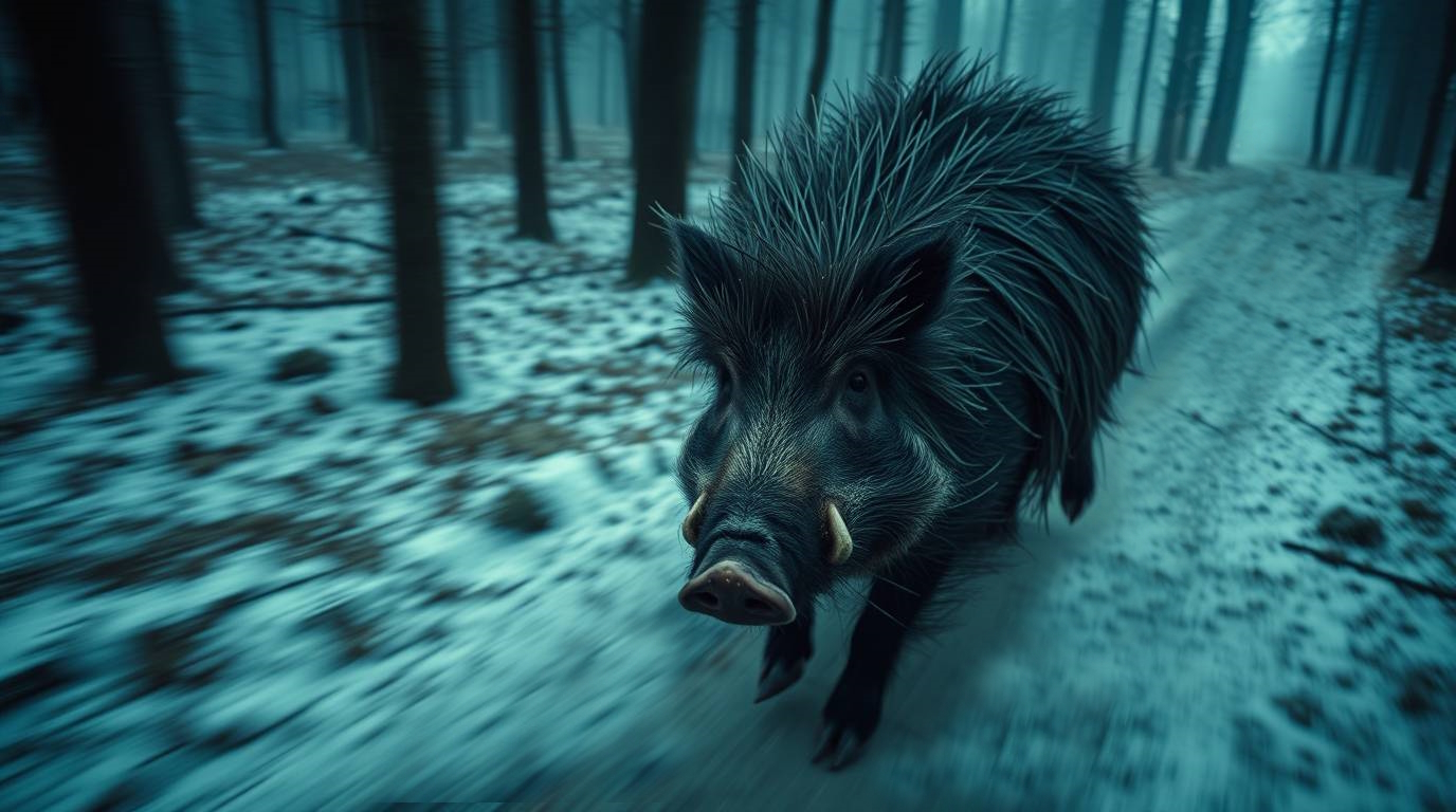 Арнольд бросается между девушкой и монстром, спотыкается и летит головой вперёд в снег. Девушка успевает сделать шаг и помочь парню встать на колени, выдернув того за куртку из сугроба. Буквально в последние секунды военный успевает дать очередь по кабану – хорошо, что оружие к стрельбе он подготовил заранее. Вепрь не останавливается, но спотыкается и несётся вперёд уже по инерции, цепляется передними ногами за корни, переворачивается через голову, проскальзывает по снегу и уже на излёте сметает с пути охотников. Всё кончено. Огромная туша ещё дёргается, пищит, но попыток встать уже не предпринимает.