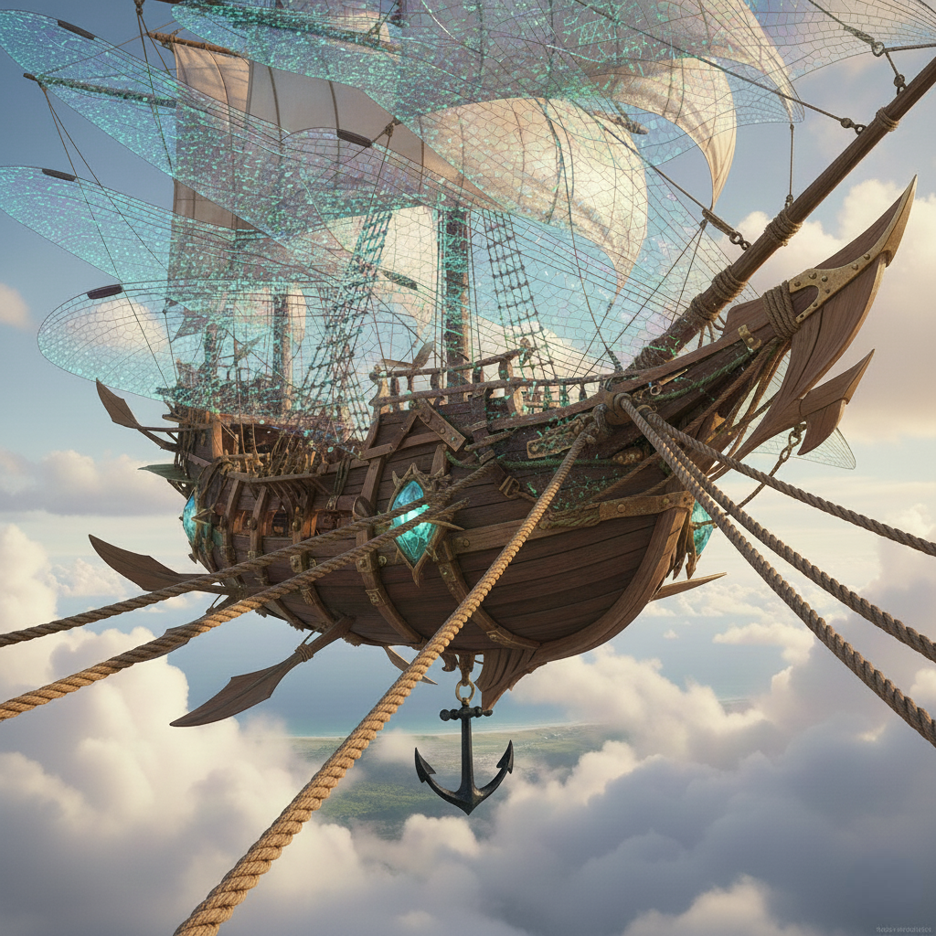 Он парил метрах в двадцати над землей, связанный толстыми тросами, слегка покачиваясь, как воздушный шар на приколе. Только никакой это был не шар, а сложный летательный аппарат: корпус из темного дерева и металла, паруса – будто целый лес стрекозиных крыльев.