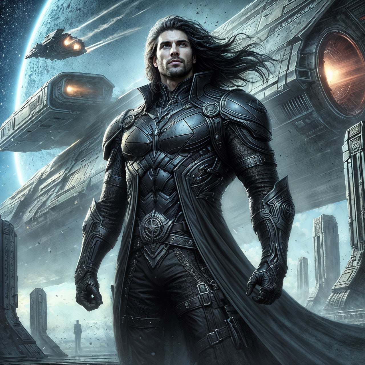 Высокий, с тёмными волосами, слегка небритый, в лёгком кожаном жилете поверх чёрной рубашки. Его поза – расслабленная, почти вызывающая. Ноги закинуты на антигравитационную подставку, а в руках он лениво крутит голографический отчёт.