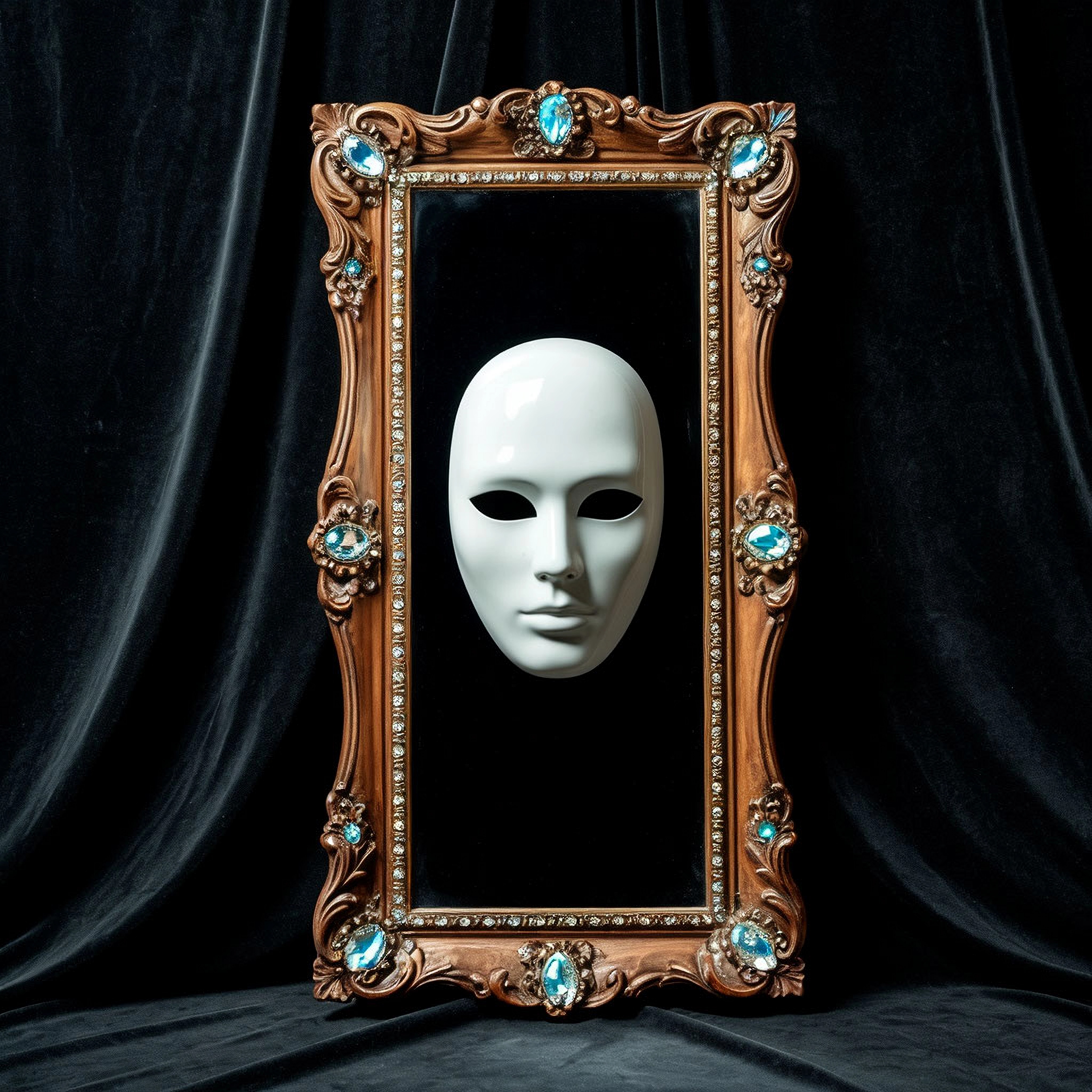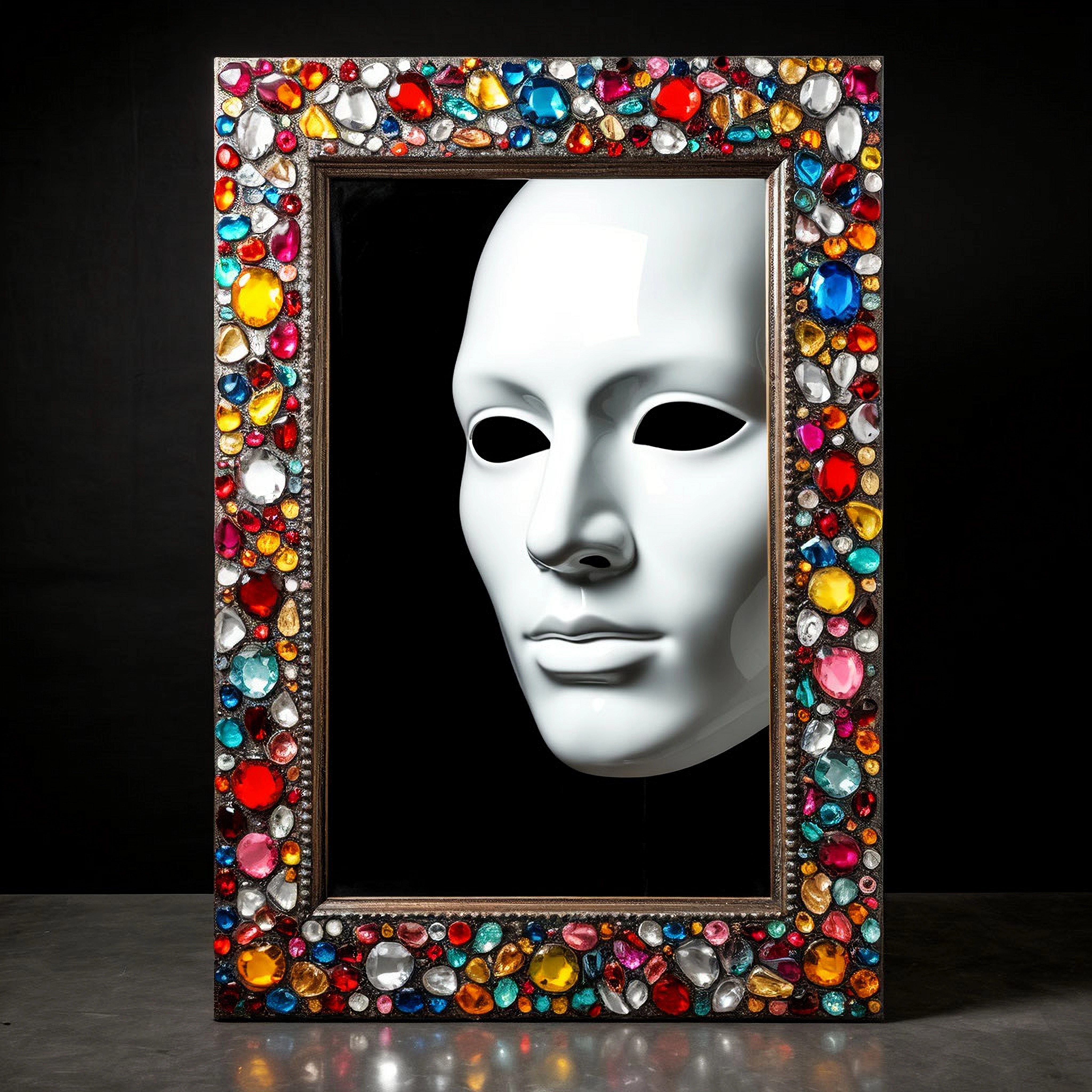 В зеркале-артефакте живет Ластро — говорящая белая маска в виде человеческого лица. Вроде представить, как это всё должно выглядеть, не сложно, но ИИ со мной не согласен.)) Вот что у нас получилось в этом тандеме. А вы выбирайте!