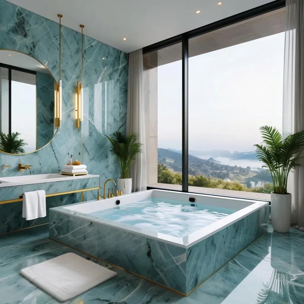 Огромная, голубая тишина, с видом на горы, вдоль которых течёт огромная река! Невероятно большое окно, в притык к нему стоит джакузи квадратной формы, по бокам два высоких белых кашпо с растениями у которых листьями, что похожи на папоротник. Большое, овальное зеркало, в золотой раме, два свисающих светильника, с длинной лампой, только вот выключателя я не наблюдаю. Ну и ладно, позже спрошу. Как этим пользоваться... Под зеркалом длинная полка, в которую встроенный умывальник, из стены торчит кран золотой, в полке золотая, длинная вешалка или всё же поручень?! На ней сложено полотенце, стоят тапочки и весит халат, белых тонов. Лежит коврик, тоже белого цвета... А всё остальное, вместе с джакузи, из голубого камня, с прожилками белого и немного, черного цвета! Всё блестит и отражается, да так, что дух уходит сквозь пятки...