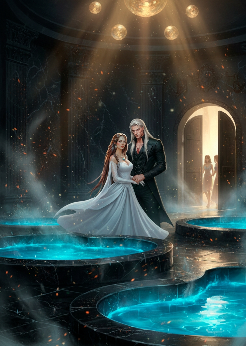 Внутри царил мягкий полумрак. Магические огни плавали под потолком, и их свет рассеивался по купальне, рождая в глубине минерала множество искр, и на фоне мерцающего камня вода в бассейне казалась сияющей.